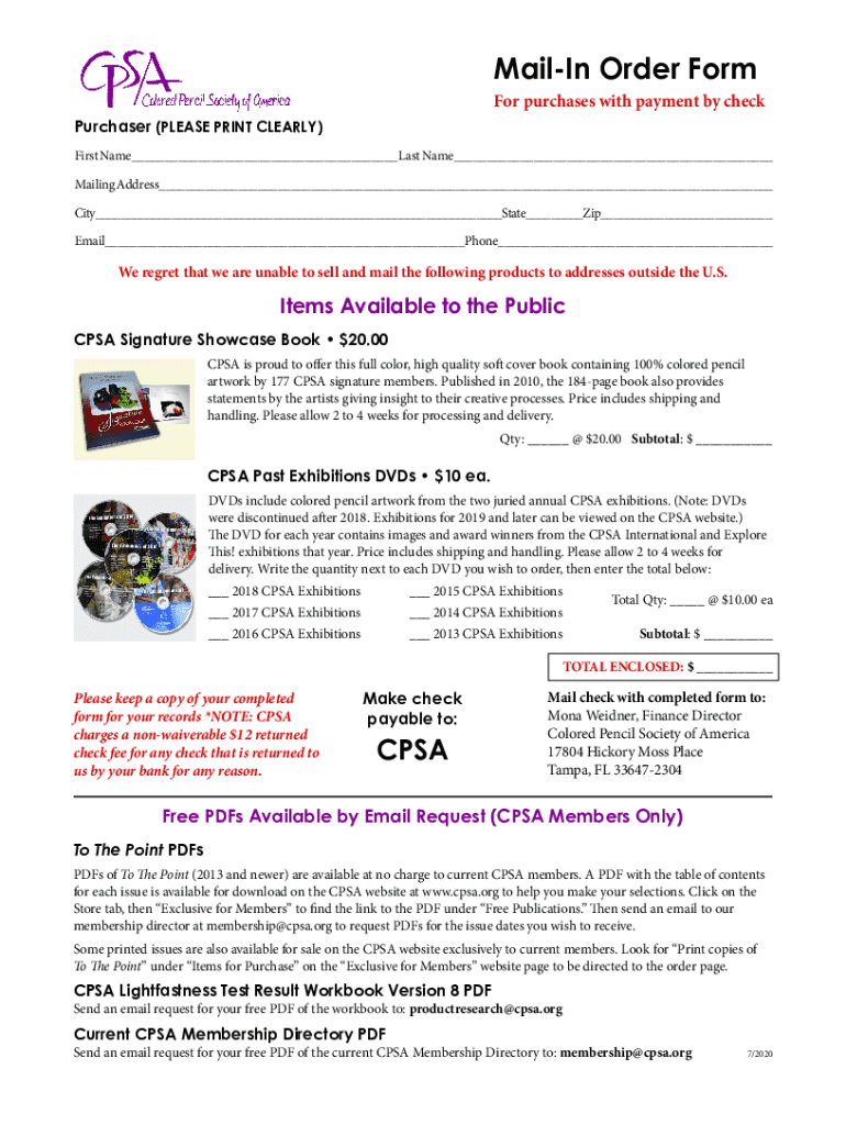 MailIn Order Form For purchases with payment by check Purchaser (PLEASE PRINT CLEARLY) First Name___ Last Name___ Mailing Address___ City___State___Zip___ Email___Phone___We regret that we are unable to sell and mail the following products to addresses outside the U.S.Items Available to the Public CPSA Signature Showcase Book $20.00 CPSA is proud to offer this full color, high quality soft cover book containing 100% colored pencil artwork by 177 CPSA signature members. Published in 2010,