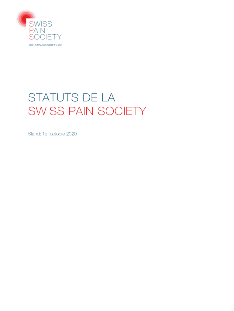 STATUTS DE LA SWISS PAIN SOCIETY Stand: 1er octobre 2020STATUTEN 1NOM, FORME JURIDIQUE ET SIGE Sous le nom de \"Swiss Pain Society\" est constitue une association au sens des articles 66 et suivants