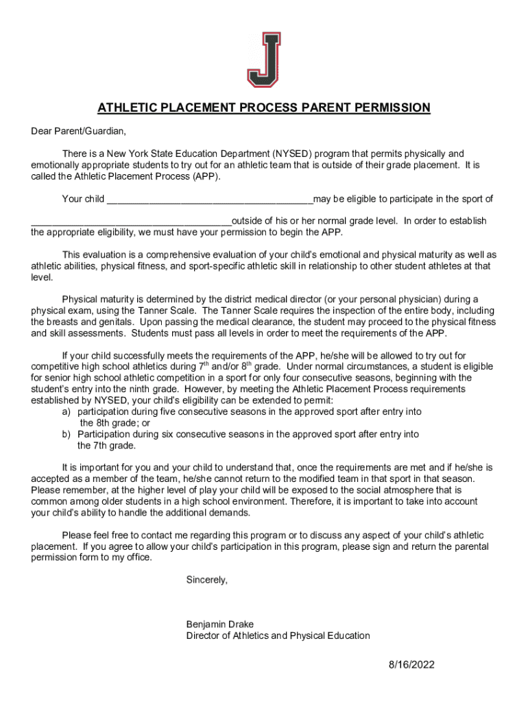 The Athletic Placement Process (APP) is designed to facilitate the inclusion of student-athletes in competitive sports, especially when they seek to compete at levels that may exceed their current age or grade group. Through this process, school districts evaluate a student’s physical and mental readiness to participate in a particular sport, ensuring appropriate placement that aligns with their abilities. The APP not only benefits the student-athletes by providing them with opportunities for higher-level competition but also enhances the overall quality of school athletics.