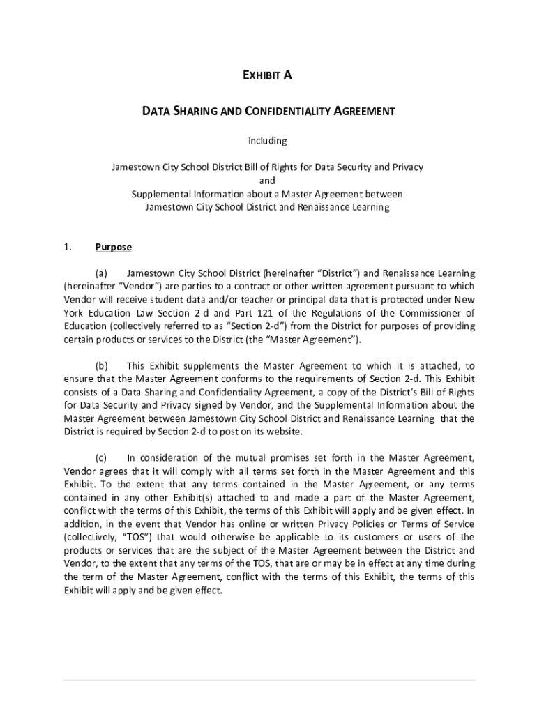 EXHIBIT A DATA SHARING AND CONFIDENTIALITY AGREEMENT Including Jamestown City School District Bill of Rights for Data Security and Privacy and Supplemental Information about a Master Agreement between Jamestown City School District and Renaissance Learning 1.Purpose(a) Jamestown City School District (hereinafter District) and Renaissance Learning (hereinafter Vendor) are parties to a contract or other written agreement pursuant to which Vendor will receive student data and/or teacher