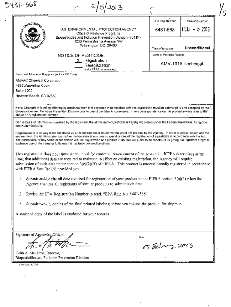Get the free US EPA, Pesticide Product Label, AMV-1018 TECHNICAL, 02/05/2013. Pesticide Product L...