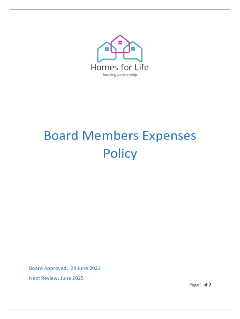 Board Members Expenses PolicyBoard Approved: 29 June 2022 Next Review: June 2025 Page 1 of 71.IntroductionHomes for Life Housing Partnership (HfL) recognised that Board Members will incur necessary expenses in the pursuit of their duties, and it has been determined that reasonable expenses will be reimbursed, subject to the conditions set out in this Policy. HfL will pay the cost and expenses wholly and necessarily incurred on its business by Board Members.2.Best PracticeTo enable