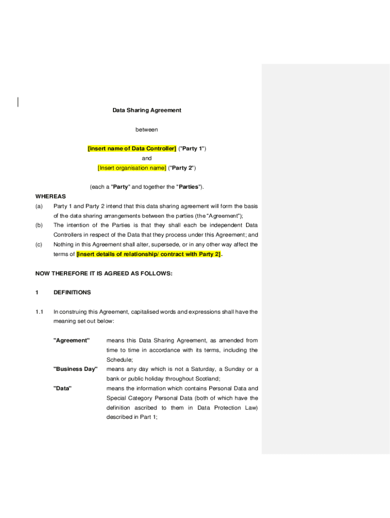 Data Sharing Agreementbetween[insert name of Data Controller] (\"Party 1\") and [Insert organisation name] (\"Party 2\")(each a \"Party\" and together the \"Parties\"). WHEREAS (a)Party 1 and Party 2 intend that this data sharing agreement will form the basis of the data sharing arrangements between the parties (the Agreement);(b)The intention of the Parties is that they shall each be independent Data Controllers in respect of the Data that they process under this Agreement; and(c)Nothing