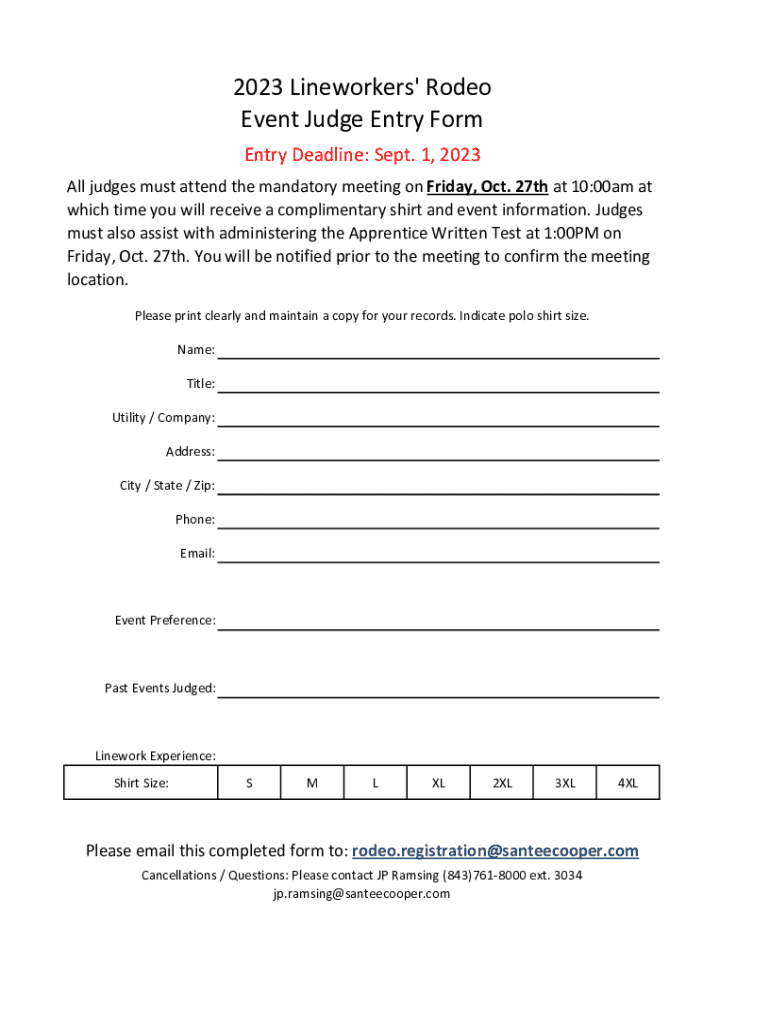 The 2023 Lineworkers039 Rodeo event form is structured to capture essential information pertinent to each participant. The first section typically requires participant information, such as name, contact details, and employment history. Completing this section accurately is critical as it establishes the competitor's identity within the event.