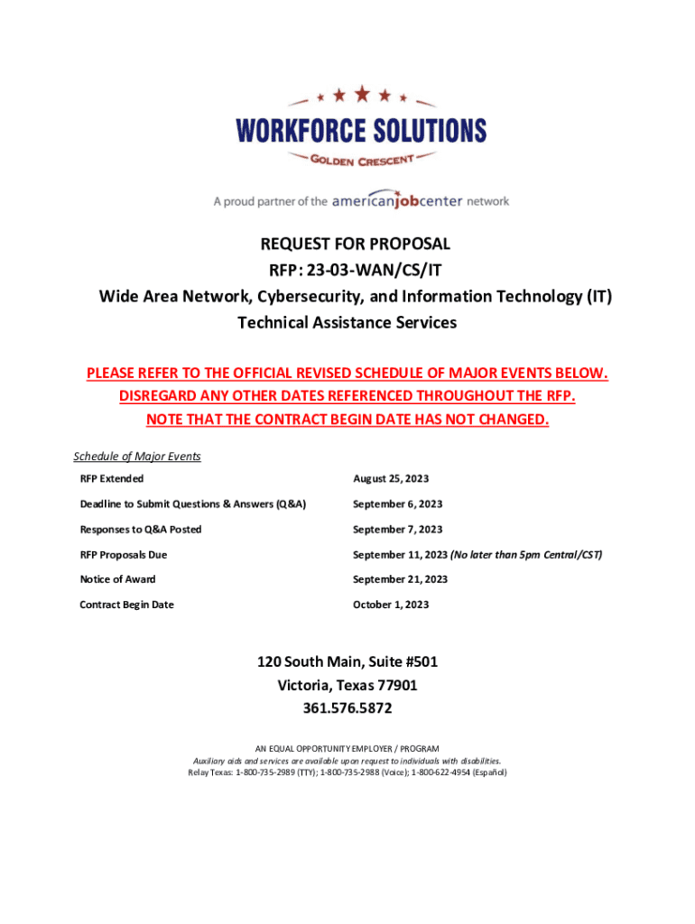 REQUEST FOR PROPOSAL RFP: 2303WAN/CS/IT Wide Area Network, Cybersecurity, and Information Technology (IT) Technical Assistance Services PLEASE REFER TO THE OFFICIAL REVISED SCHEDULE OF MAJOR EVENTS