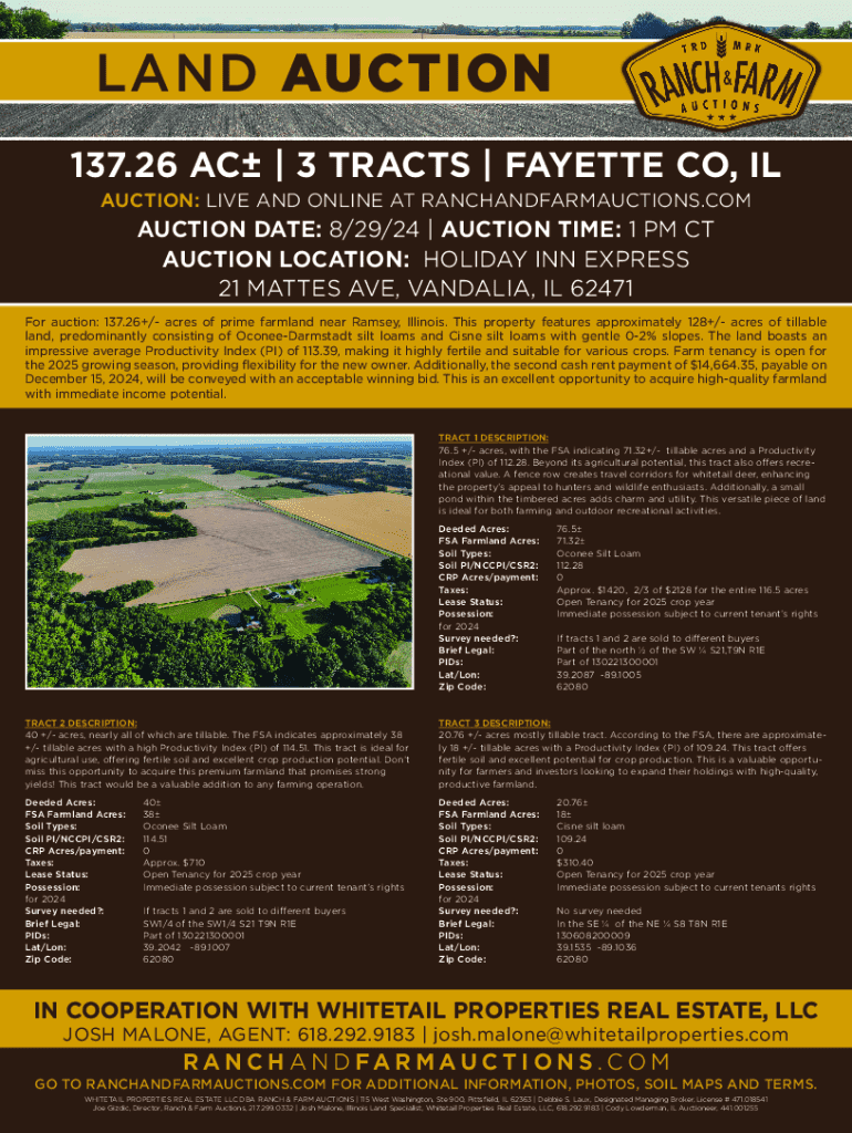 LAND AUCTION 137.26 AC | 3 TRACTS | FAYETTE CO, IL AUCTION: LIVE AND ONLINE AT RANCHANDFARMAUCTIONS.COMAUCTION DATE: 8/29/24 | AUCTION TIME: 1 PM CT AUCTION LOCATION: HOLIDAY INN EXPRESS 21 MATTES AVE, VANDALIA, IL 62471 For auction: 137.26+/ acres of prime farmland near Ramsey, Illinois. This property features approximately 128+/ acres of tillable land, predominantly consisting of OconeeDarmstadt silt loams and Cisne silt loams with gentle 02% slopes. The land boasts an impressive average...