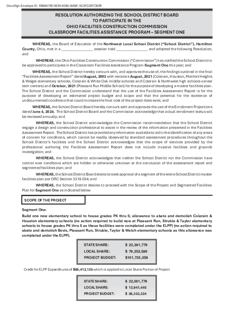 RESOLUTION AUTHORIZING THE SCHOOL DISTRICT BOARD TO PARTICIPATE IN THE OHIO FACILITIES CONSTRUCTION COMMISSION CLASSROOM FACILITIES ASSISTANCE PROGRAM SEGMENT ONE WHEREAS, the Board of Education of