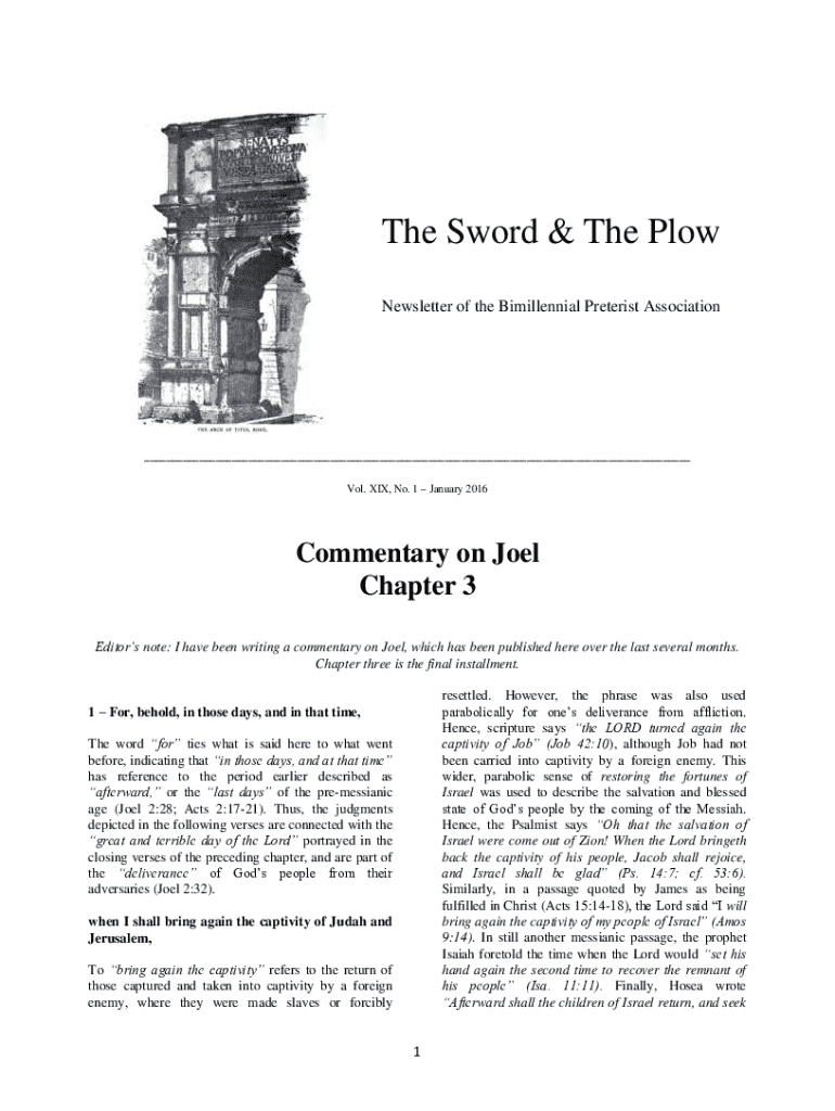 The Sword & The Plow Newsletter of the Bi millennial Preterit Association___ Vol. XIX, No. 1 January 2016Commentary on Joel Chapter 3 Editors note: I have been writing a commentary on Joel, which