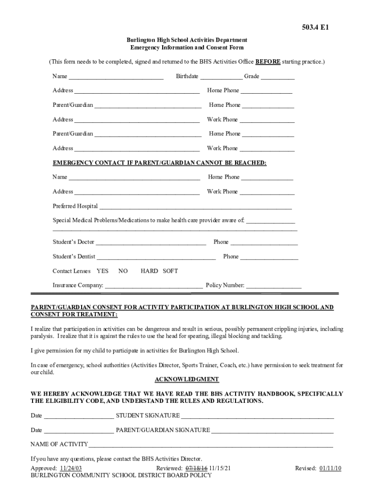 Get the free Burlington High School Activities Department Emergency/ ...