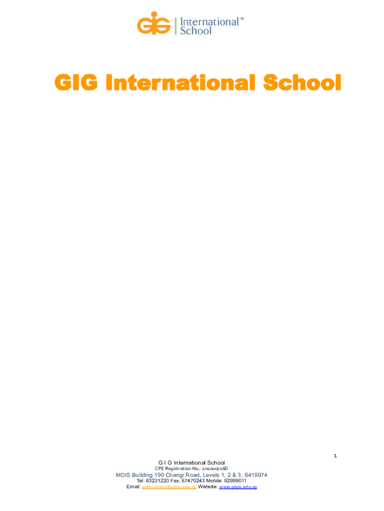 1 G I G International School CPE Registration No.: 201000716DMDIS Building 190 Changi Road, Levels 1, 2 & 3, S419974 Tel: 63231220 Fax: 67470243 Mobile: 92999011 Email: admissions@gigis.edu.sg Website: