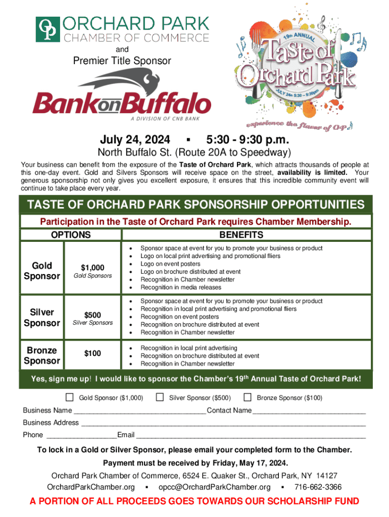 andPremier Title SponsorJuly 24, 20245:30 9:30 p.m.North Buffalo St. (Route 20A to Speedway) Your business can benefit from the exposure of the Taste of Orchard Park, which attracts thousands of people at this oneday event. Gold and Silvers Sponsors will receive space on the street, availability is limited. Your generous sponsorship not only gives you excellent exposure, it ensures that this incredible community event will continue to take place every year.TASTE OF ORCHARD PARK