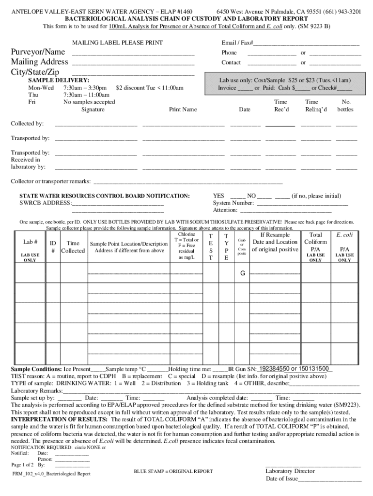 ANTELOPE VALLEYS KERN WATER AGENCY LAP #1460 6450 West Avenue N Palmdale, CA 93551 (661) 9433201 BACTERIOLOGICAL ANALYSIS CHAIN OF CUSTODY AND LABORATORY REPORT This form is to be used for 100mL Analysis