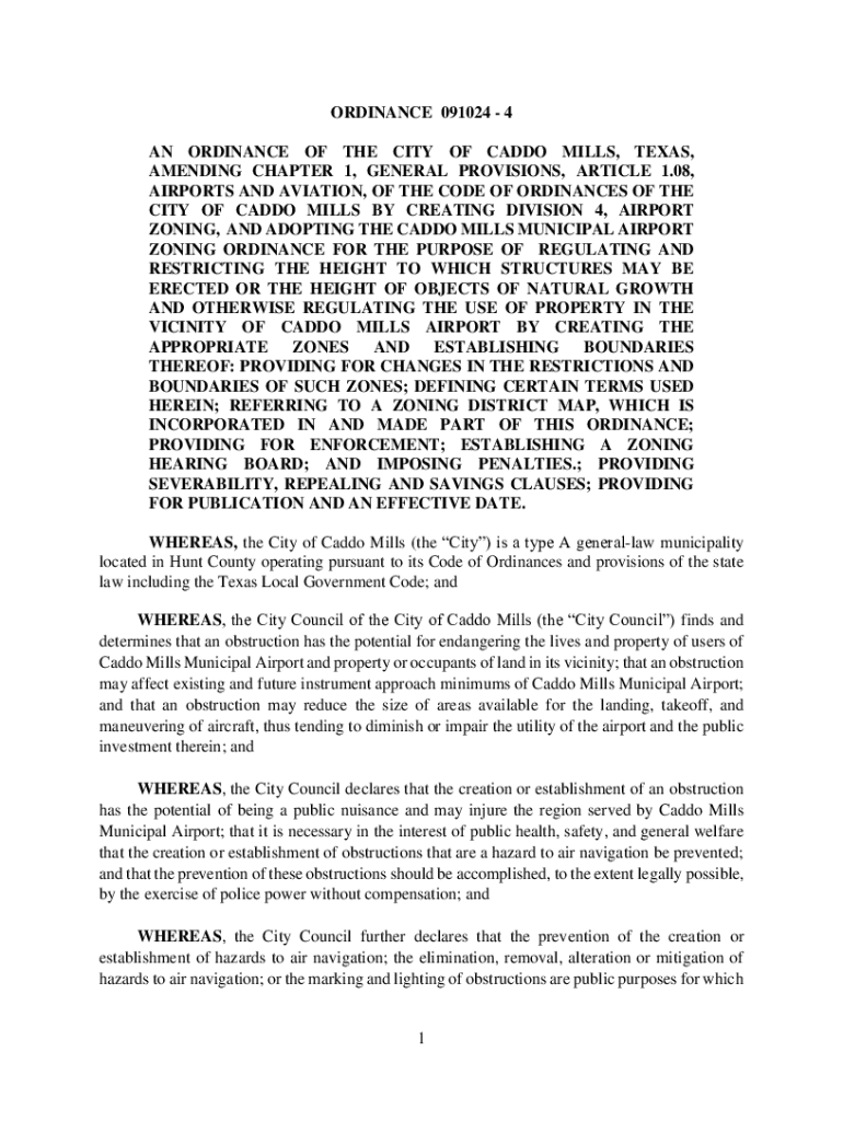 ORDINANCE 091024 4 AN ORDINANCE OF THE CITY OF CADDO MILLS, TEXAS, AMENDING CHAPTER 1, GENERAL PROVISIONS, ARTICLE 1.08, AIRPORTS AND AVIATION, OF THE CODE OF ORDINANCES OF THE CITY OF CADDO MILLS