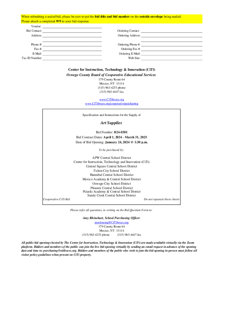When submitting a sealed bid, please be sure to put the bid title and bid number on the outside envelope being mailed. Please attach a completed W9 to your bid response. Vendor: Bid Contact: Address:Ordering