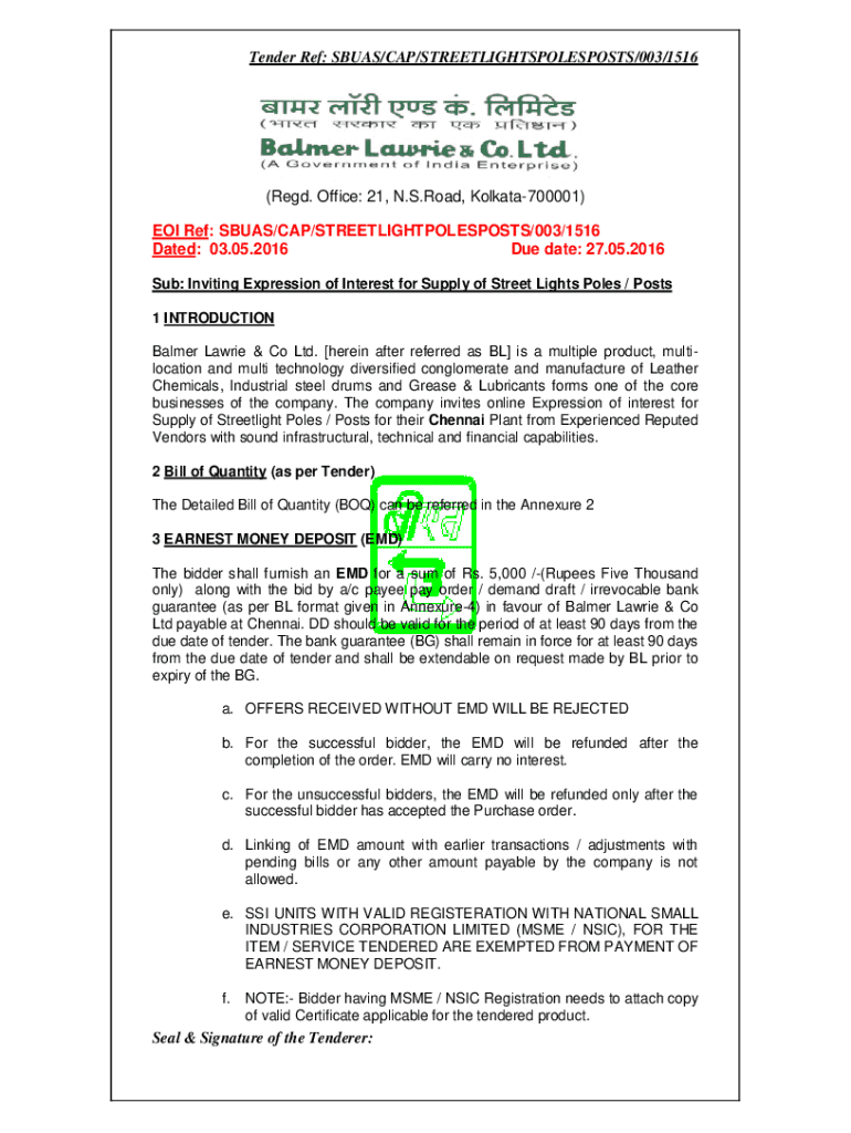Tender Ref: SBUAS/CAP/STREETLIGHTSPOLESPOSTS/003/1516(Regd. Office: 21, N.S.Road, Kolkata700001) EOI Ref: SBUAS/CAP/STREETLIGHTPOLESPOSTS/003/1516 Dated: 03.05.2016 Due date: 27.05.2016 Sub: Inviting Expression of Interest for Supply of Street Lights Poles / Posts 1 INTRODUCTION Balmer Lawrie & Co Ltd. [herein after referred as BL] is a multiple product, multilocation and multi technology diversified conglomerate and manufacture of Leather Chemicals, Industrial steel drums and Grease &...