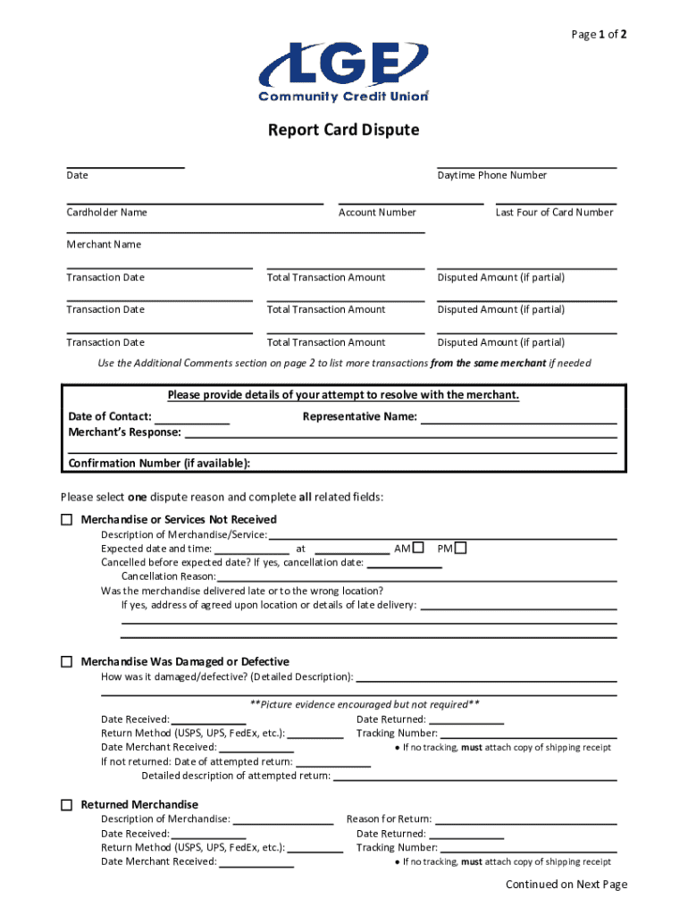 Page 1 of 2Report Card Dispute Date. Daytime Phone Number. Cardholder Name. . Account Number. Last Four of Card Number. Merchant Name. Transaction Date. Total Transaction Amount. Disputed Amount (if