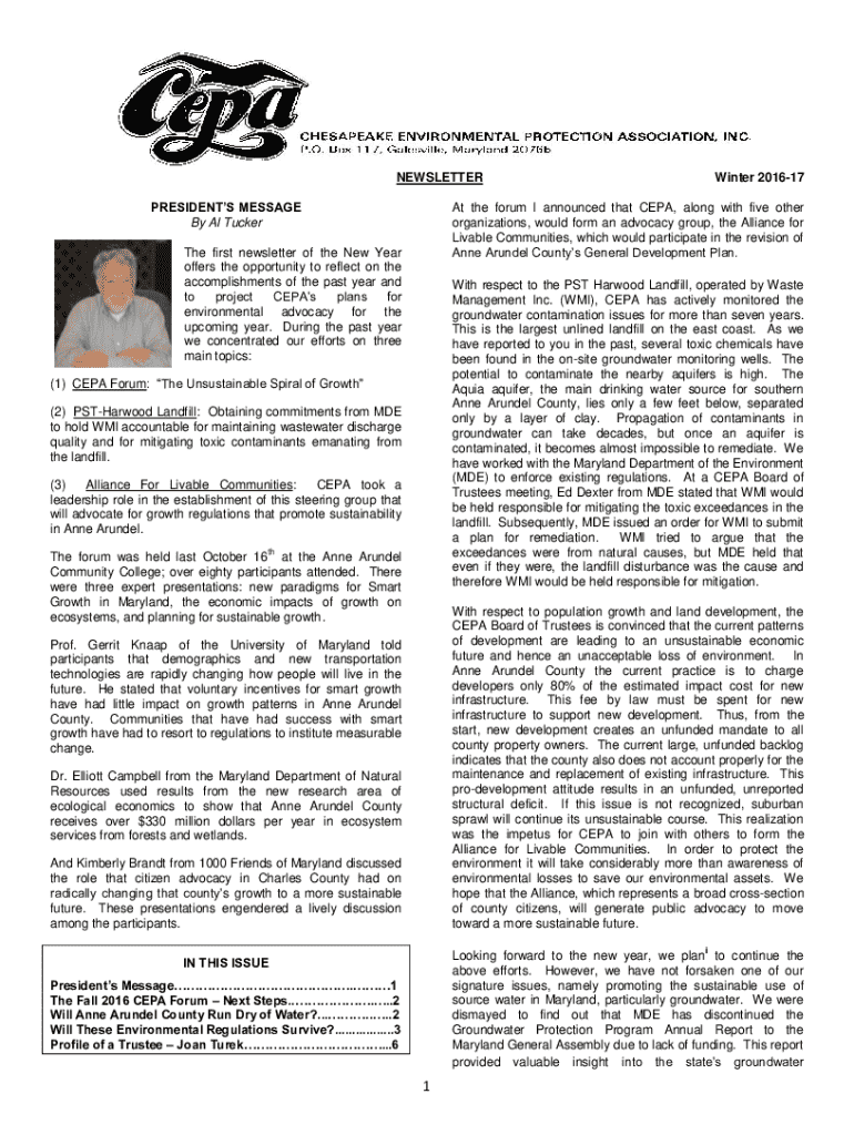 NEWSLETTER PRESIDENTS MESSAGE By Al TuckerWinter 201617At the forum I announced that CEPA, along with five other organizations, would form an advocacy group, the Alliance for Livable Communities,