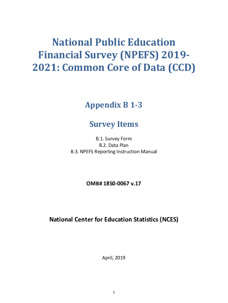 National Public Education Financial Survey (NPEFS) 20192021: Common Core of Data (CCD) Appendix B 13 Survey Items B.1. Survey Form B.2. Data Plan B.3. NPEFS Reporting Instruction ManualOMB# 18500067