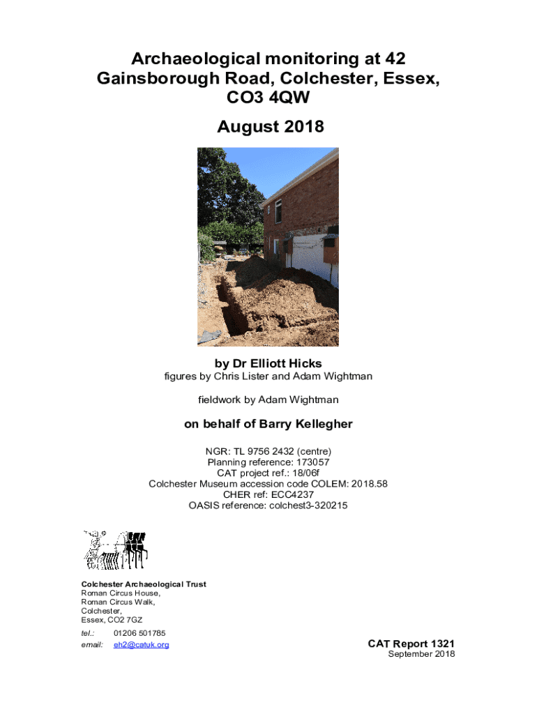 Archaeological monitoring at 42 Gainsborough Road, Colchester, Essex, CO3 4QW August 2018by Dr Elliott Hicks figures by Chris Lister and Adam Wightman fieldwork by Adam Wightmanon behalf of Barry Kellegher NGR: TL 9756 2432 (centre) Planning reference: 173057 CAT project ref.: 18/06f Colchester Museum accession code COLEM: 2018.58 CHER ref: ECC4237 OASIS reference: colchest3320215Colchester Archaeological Trust Roman Circus House, Roman Circus Walk, Colchester, Essex, CO2 7GZ tel.:...