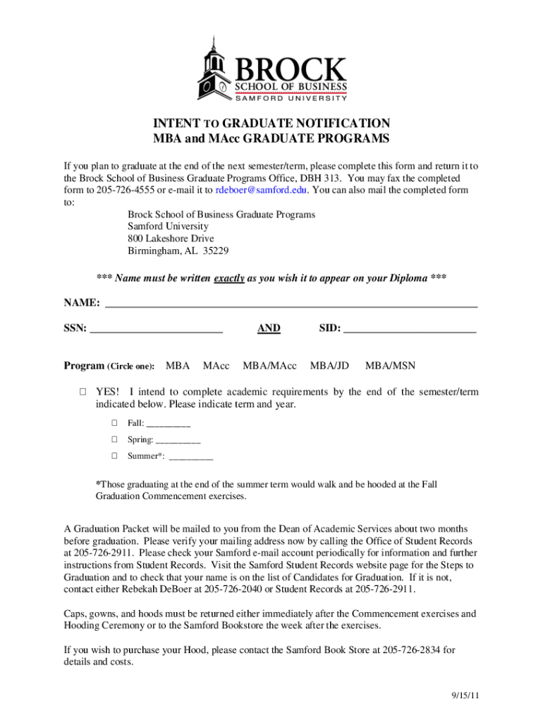 INTENT TO GRADUATE NOTIFICATION MBA and MAcc GRADUATE PROGRAMS If you plan to graduate at the end of the next semester/term, please complete this form and return it to the Brock School of Business Graduate Programs Office, DBH 313. You may fax the completed form to 2057264555 or email it to rdeboer@samford.edu. You can also mail the completed form to: Brock School of Business Graduate Programs Samford University 800 Lakeshore Drive Birmingham, AL 35229*** Name must be written exactly as you