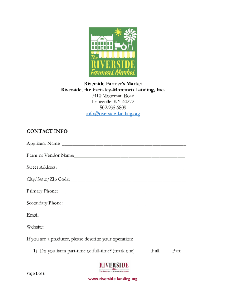 Riverside Farmers Market Riverside, the FarnsleyMoremen Landing, Inc. 7410 Moorman Road Louisville, KY 40272 502.935.6809 info@riversidelanding.org CONTACT INFO Applicant Name: ___ Farm or Vendor Name:___ Street Address:___ City/State/Zip Code:___ Primary Phone:___ Secondary Phone:___ Email:___ Website: ___ If you are a producer, please describe your operation: 1) Do you farm parttime or fulltime? (mark one) ___ Full ___PartPage 1 of 3www.riversidelanding.org2) List any other farmers
