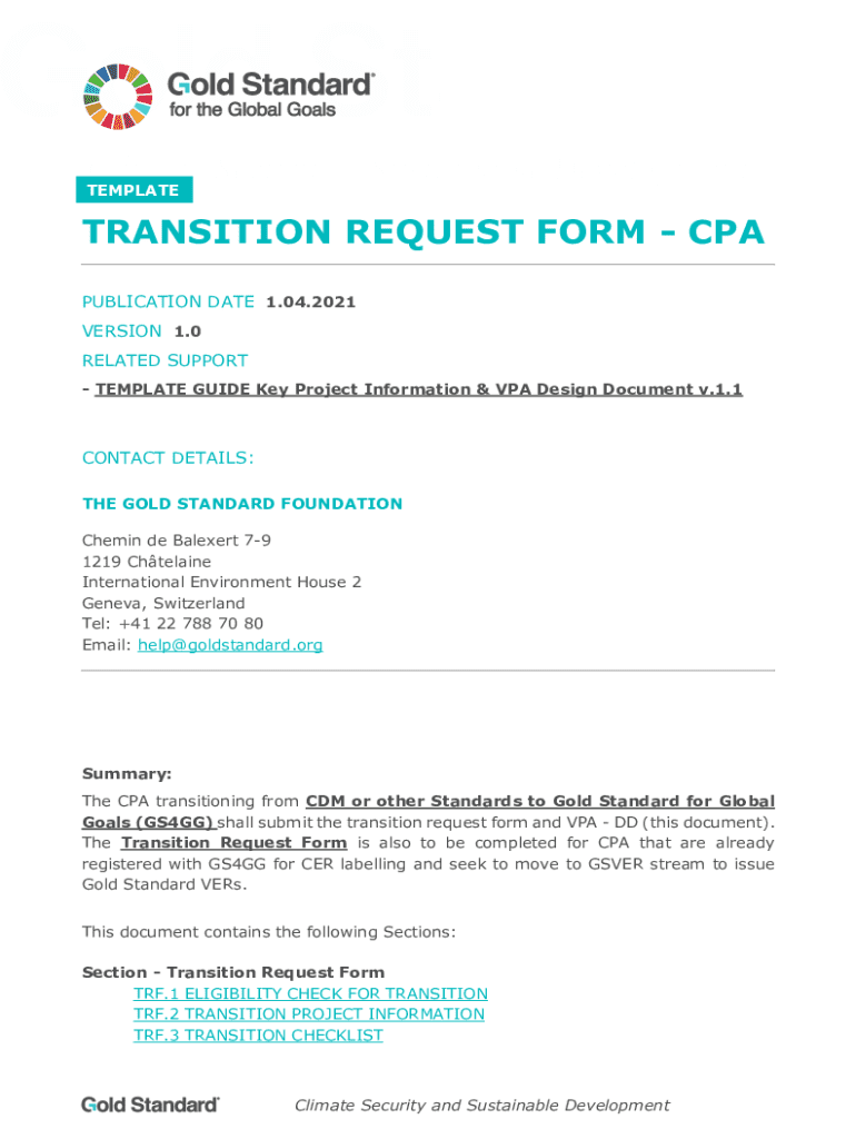 TEMPLATETRANSITION REQUEST FORM CPA PUBLICATION DATE 1.04.2021 VERSION 1.0 RELATED SUPPORT TEMPLATE GUIDE Key Project Information & VPA Design Document v.1.1CONTACT DETAILS: THE GOLD STANDARD FOUNDATION Chemin de Balexert 79 1219 Chtelaine International Environment House 2 Geneva, Switzerland Tel: +41 22 788 70 80 Email: help@goldstandard.orgSummary: The CPA transitioning from CDM or other Standards to Gold Standard for Global Goals (GS4GG) shall submit the transition request form and VPA DD...