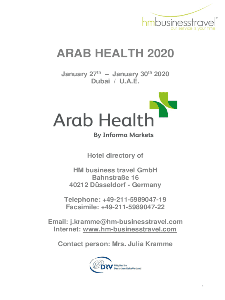 ARAB HEALTH 2020 January 27th January 30th 2020 Dubai / U.A.E. Hotel directory of HM business travel GmbH Balustrade 16 40212 Dusseldorf Germany Telephone: +49211598904719 Facsimiles: +49211598904722