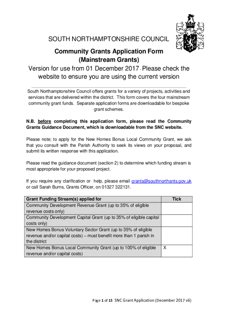 SOUTH NORTHAMPTONSHIRE COUNCIL Community Grants Application Form (Mainstream Grants) Version for use from 01 December 2017 Please check the website to ensure you are using the current version South