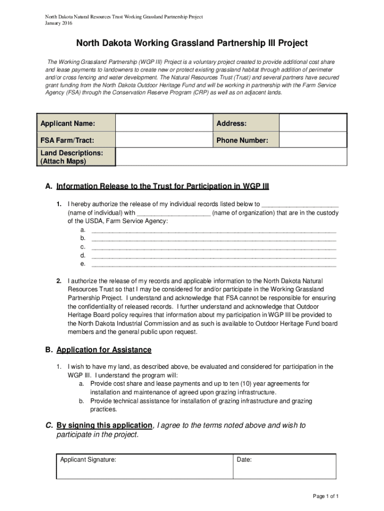 North Dakota Natural Resources Trust Working Grassland Partnership Project January 2016North Dakota Working Grassland Partnership III Project The Working Grassland Partnership (WGP III) Project is a voluntary project created to provide additional cost share and lease payments to landowners to create new or protect existing grassland habitat through addition of perimeter and/or cross fencing and water development. The Natural Resources Trust (Trust) and several partners have secured grant funding