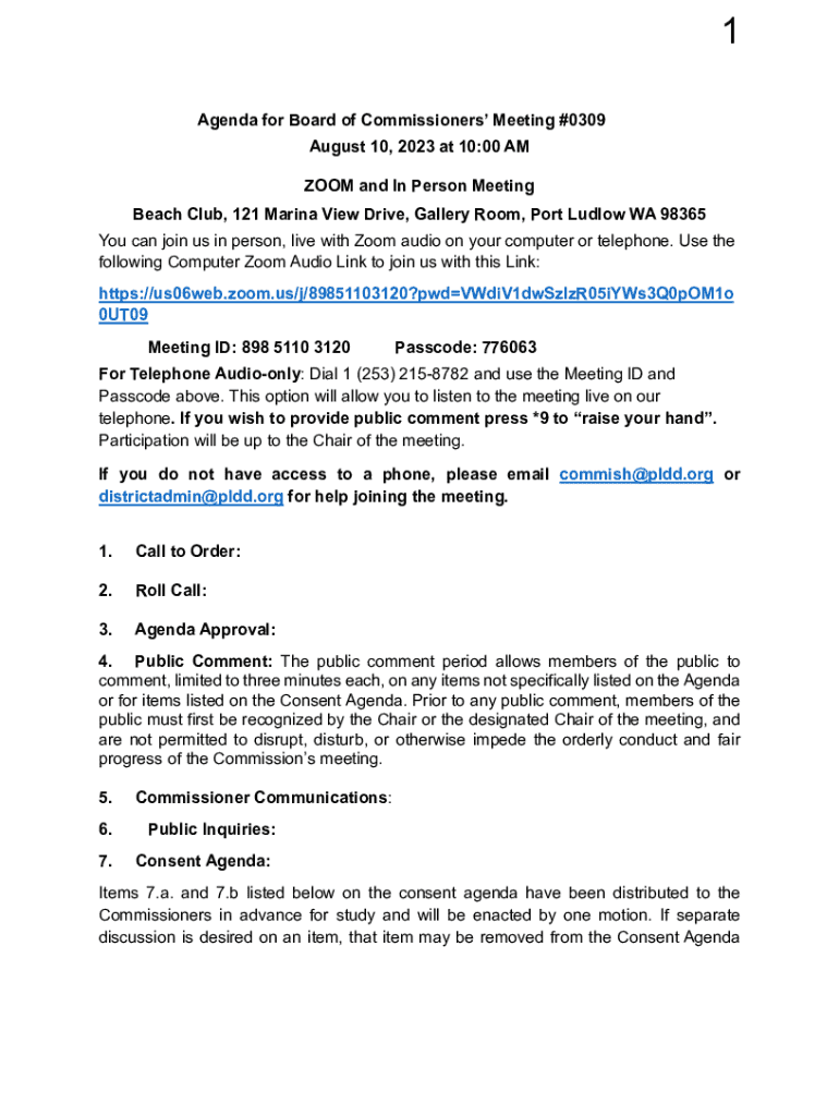 1 Agenda for Board of Commissioners Meeting #0309 August 10, 2023, at 10:00 AM ZOOM and In Person Meeting Beach Club, 121 Marina View Drive, Gallery Room, Port Ludo WA 98365 You can join us in person,