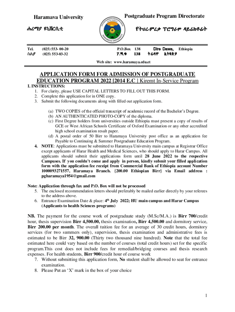 Aramaic University N[T y`+Tel. EM(025) 553 0020 (025) 5530332Postgraduate Program Directorate I[U[n a __P. O. Box 138. X.l 138Dire Data, Ethiopia _ Website: www.haramaya.edu.etAPPLICATION FORM FOR
