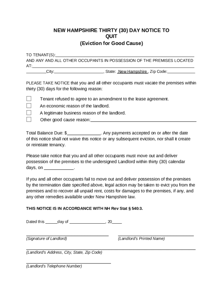 What is New Hampshire 30 Day Notice to Quit (Eviction for Good Cause) Form?