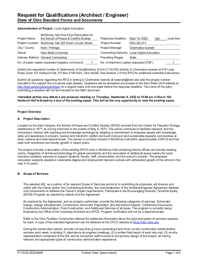 Request for Qualifications (Architect / Engineer) State of Ohio Standard Forms and Documents Administration of Project: Local Higher Education Project NameMcGilvrey Hall First Floor Renovation for the School of Peace & Conflict StudiesResponse DeadlineSept 19, 2022Project Location McGilvrey Hall 325 South Lincoln StreetProject NumberKSU23L017City / CountyKent / PortageProject ManagerCharmaine IwanskiOwnerKent State UniversityContracting Authority Local Higher EducationDelivery