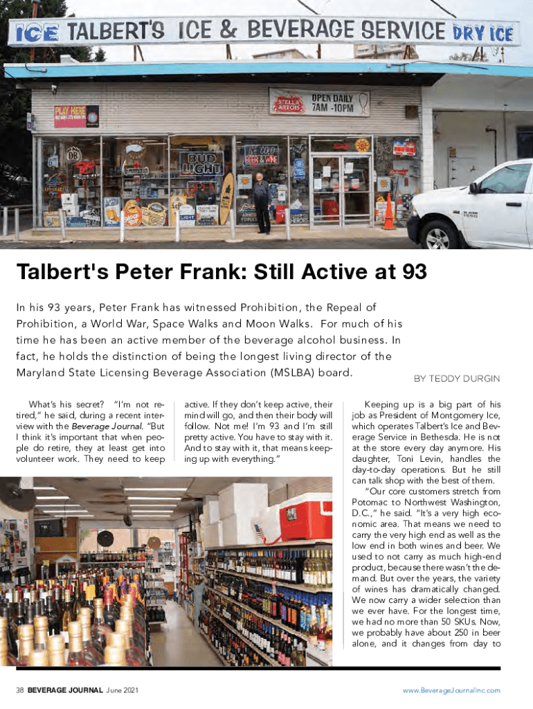 Talbert\'s Peter Frank: Still Active at 93 In his 93 years, Peter Frank has witnessed Prohibition, the Repeal of Prohibition, a World War, Space Walks and Moon Walks. For much of his time he has been an active member of the beverage alcohol business. In fact, he holds the distinction of being the longest living director of the Maryland State Licensing Beverage Association (MSLBA) board. Whats his secret? Im not retired, he said, during a recent interview with the Beverage Journal. But I