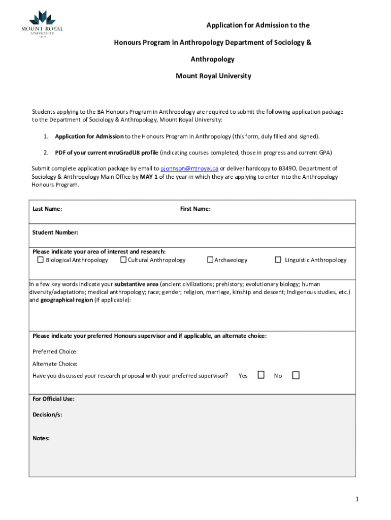 Application for Admission to the Honours Program in Anthropology Department of Sociology & Anthropology Mount Royal UniversityStudents applying to the BA Honours Program in Anthropology are required to submit the following application package to the Department of Sociology & Anthropology, Mount Royal University: 1. Application for Admission to the Honours Program in Anthropology (this form, duly filled and signed). 2.PDF of your current mruGradU8 profile (indicating courses completed, those in