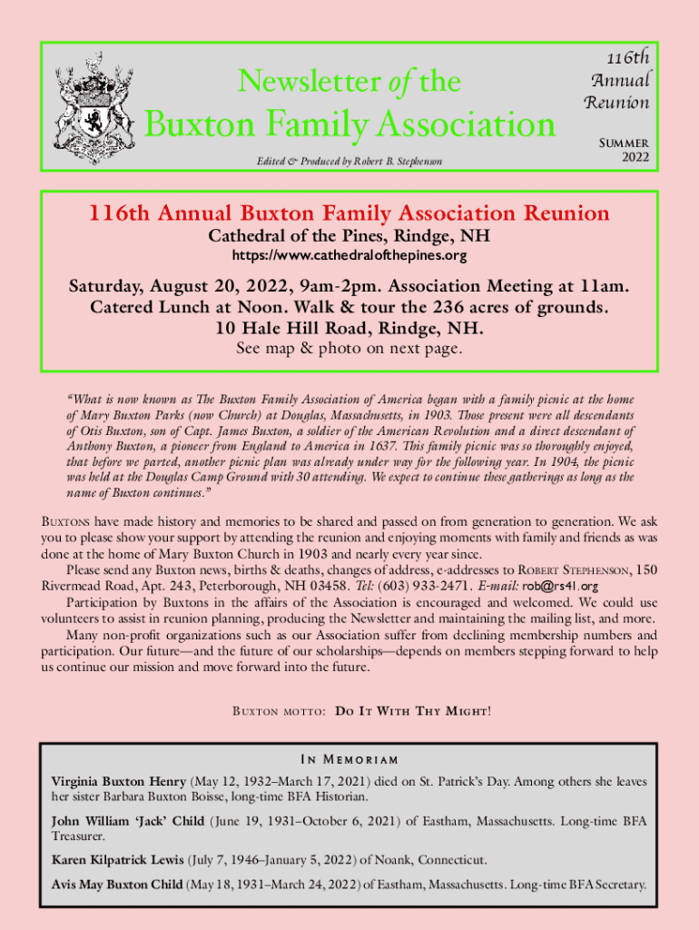 Newsletter of Teuton Family Association Edited & Produced by Robert B. Stephenson116th Annual Reunion Summer 2022116th Annual Button Family Association Reunion Cathedral of the Pines, Ridge, NH https://www.cathedralofthepines.orgSaturday,