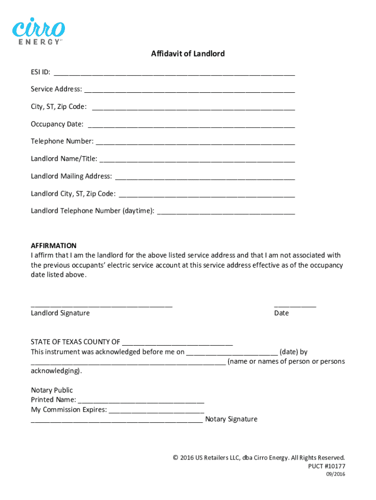 Affidavit of Landlord ESI ID: ___ Service Address: ___ City, ST, Zip Code: ___ Occupancy Date: ___ Telephone Number: ___ Landlord Name/Title: ___ Landlord Mailing Address: ___ Landlord City, ST, Zip