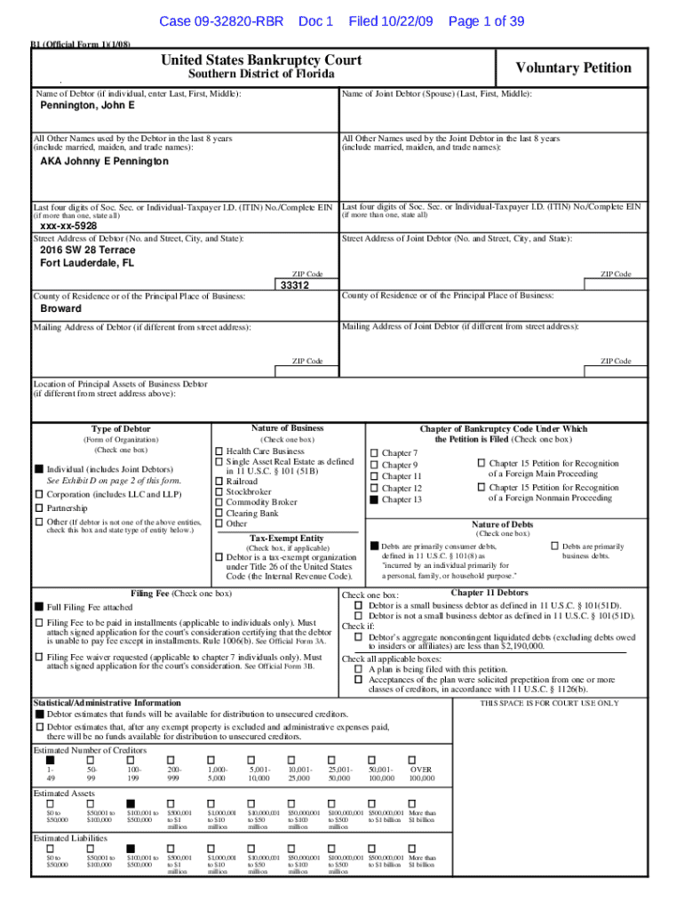 Case 0932820RBRDoc 1Filed 10/22/09Page 1 of 39B1 (Official Form 1)(1/08)United States Bankruptcy CourtVoluntary PetitionSouthern District of Florida b k 1 F o r m . V l u n t a y P e iName of Joint Debtor (Spouse) (Last, First, Middle):Name of Debtor (if individual, enter Last, First, Middle):Pennington, John E All Other Names used by the Joint Debtor in the last 8 years (include married, maiden, and trade names):All Other Names used by the Debtor in the last 8 years (include