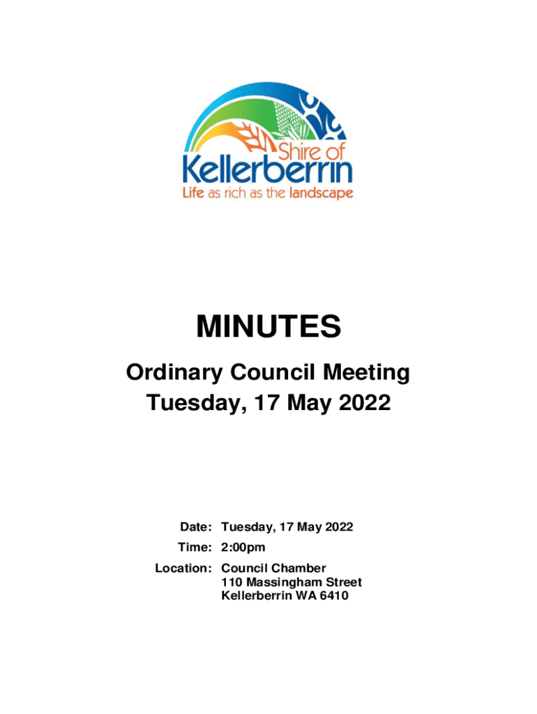 MINUTES Ordinary Council Meeting Tuesday, 17 May 2022Date: Tuesday, 17 May 2022 Time: 2:00pm Location: Council Chamber 110 Massingham Street Kellerberrin WA 6410Ordinary Council Meeting Minutes17 May 2022Order Of Business 1Declaration of Opening ....................................................................................................... 42Announcement by Presiding Person Without Discussion ................................................ 4 2.1President Report April 2022