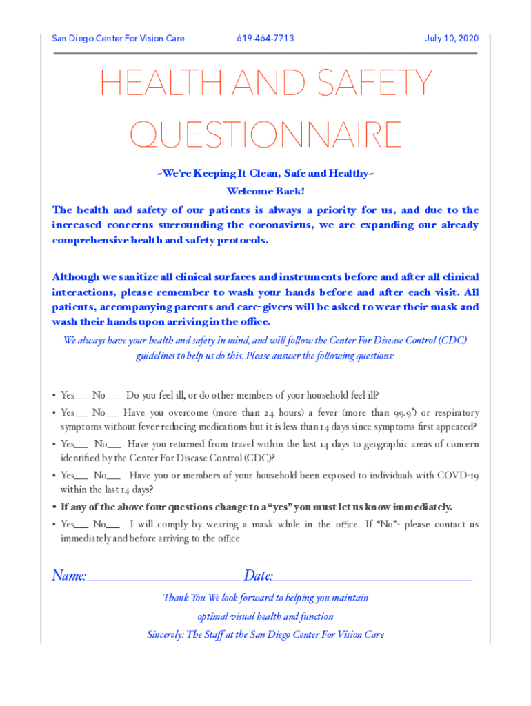San Diego Center For Vision Care6194647713July 10, 2020HEALTH AND SAFETY QUESTIONNAIRE Were Keeping It Clean, Safe and Healthy Welcome Back! The health and safety of our patients is always a priority
