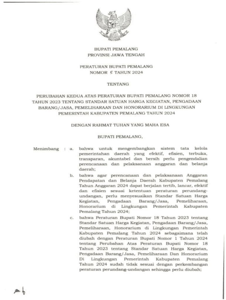 BUPATI PEMALANG PROVINSI JAWA TENGAH PERATURAN BUPATI PEMALANG NOMOR S TAHUN 2024 TENTANG PERUBAHAN KEDUA ATAS PERATURAN BUPATI PEMALANG NOMOR 18 TAHUN 2023 TENTANG STANDAR SATUAN HARGA KEGIATAN,