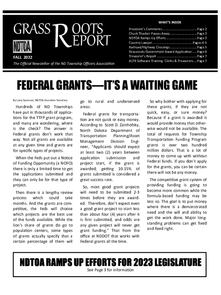 GRASS FALL 2022ROOTS EPORTTheOcialNewsle eroftheNDTownshipOcersAssocia onWHATS INSIDE Presidents Comments ......................................Page 2 Chuck Thacker Passes Away ..............................Page 3 NDTOA Ramps Up Eorts ..................................Page 3 Country Lawyer ............................................ Pages 45 Railroad/Highway Crossings ..............................Page 5 Grassroots Government Award Applica on .....Page 6 Treasurers Report