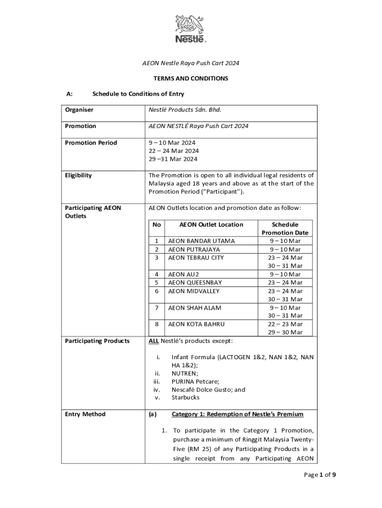 Eon Nestle Ray Push Cart 2024 TERMS AND CONDITIONS A:Schedule to Conditions of EntryOrganiserNestl Products SDN. BHD. PromotionAEON NEST Ray Push Cart 2024Promotion Period9 10 Mar 2024 22 24 Mar 2024