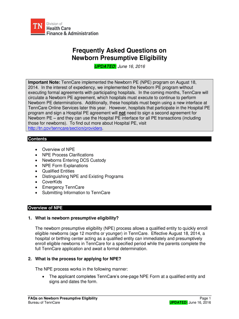 Get the free Important Note: TennCare implemented the Newborn PE (NPE) program on August 18,