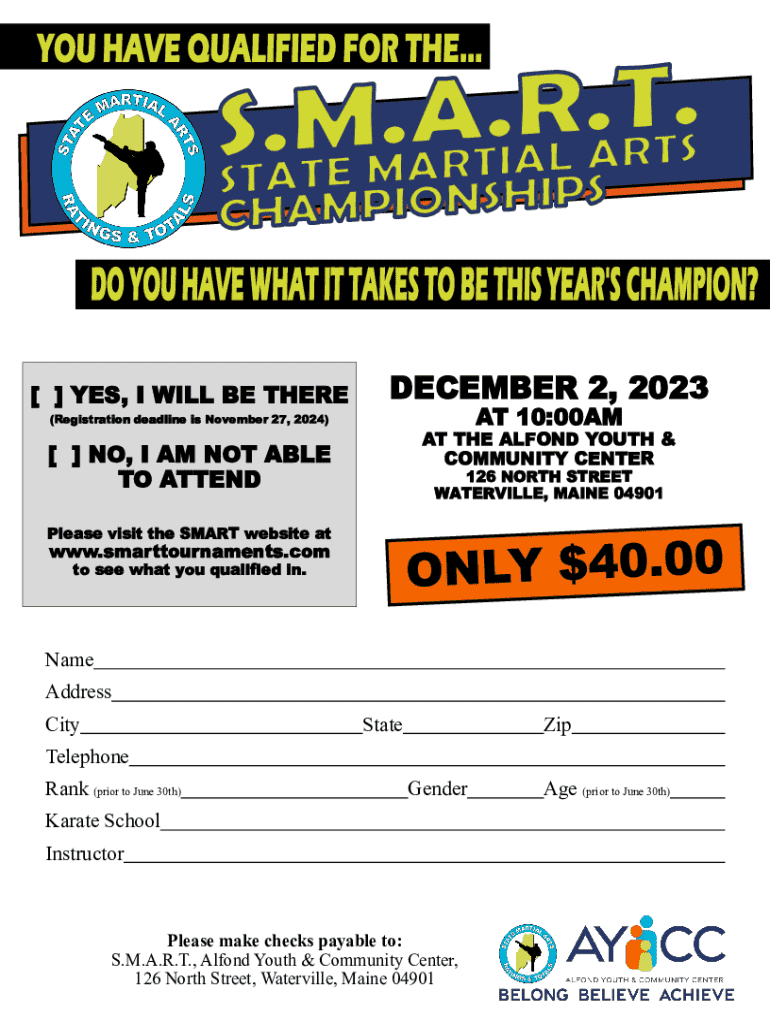 [ ] YES, I WILL BE THEREDECEMBER 2, 2023 AT 10:00AM(Registration deadline is November 27, 2024)AT THE ALMOND YOUTH & COMMUNITY CENTER[ ] NO, I AM NOT ABLE TO ATTEND126 NORTH STREET WATERVILLE, MAINE