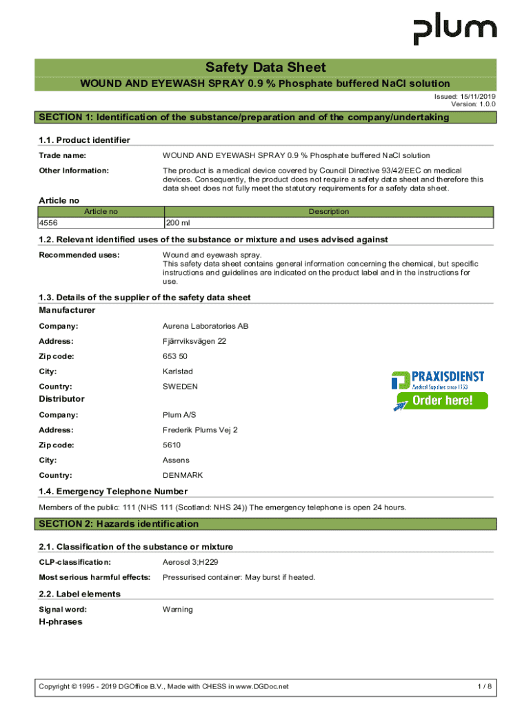 Safety Data Sheet WOUND AND EYEWASH SPRAY 0.9 % Phosphate buffered NaCl solution Issued: 15/11/2019 Version: 1.0.0SECTION 1: Identification of the substance/preparation and of the company/undertaking