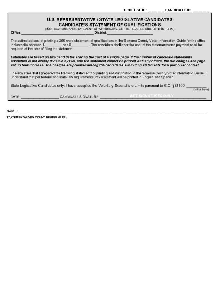 The candidate statement form is a document that candidates for public office in the United States must file to declare their intention to run for election and provide essential information about themselves.