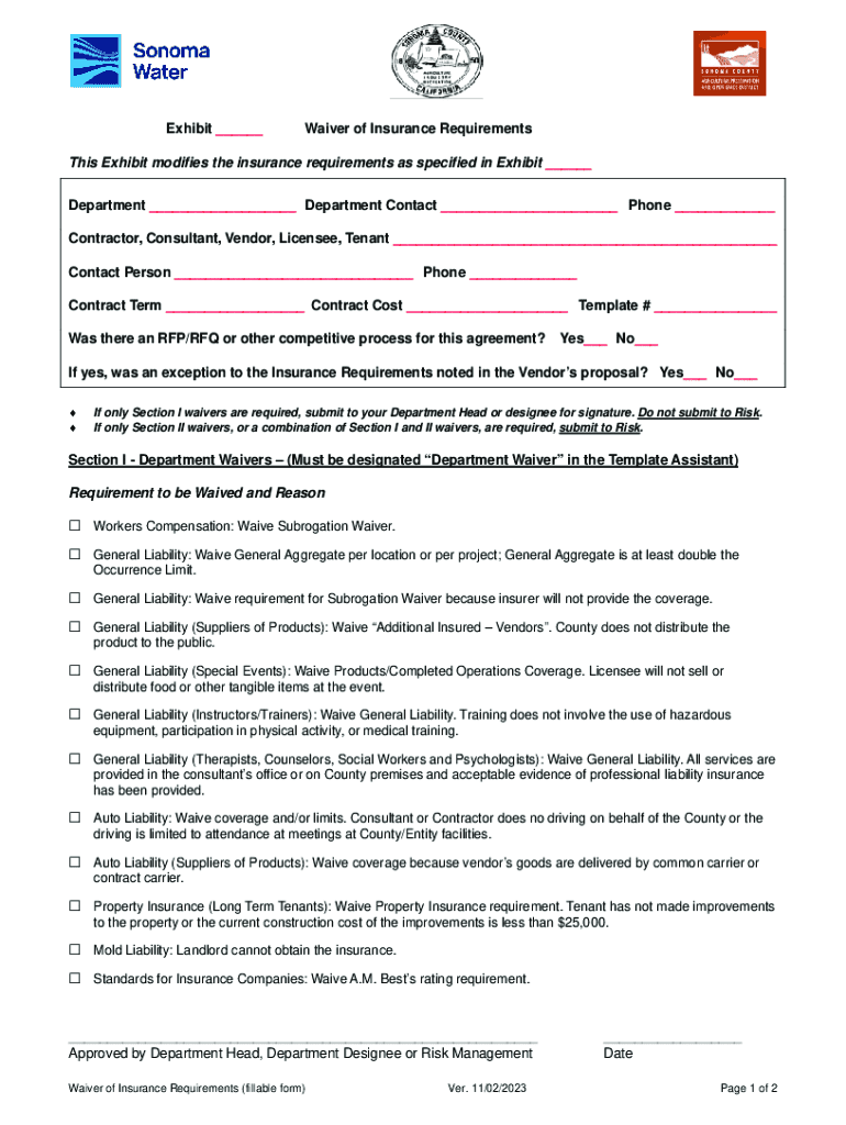 Exhibit ___Waiver of Insurance RequirementsThis Exhibit modifies the insurance requirements as specified in Exhibit ___ Department ___ Department Contact ___ Phone ___ Contractor, Consultant, Vendor, Licensee, Tenant ___ Contact Person ___ Phone ___ Contract Term ___ Contract Cost ___ Template # ___ Was there an RFP/RFQ or other competitive process for this agreement?Yes___ No___If yes, was an exception to the Insurance Requirements noted in the Vendors proposal? Yes___ No___ If