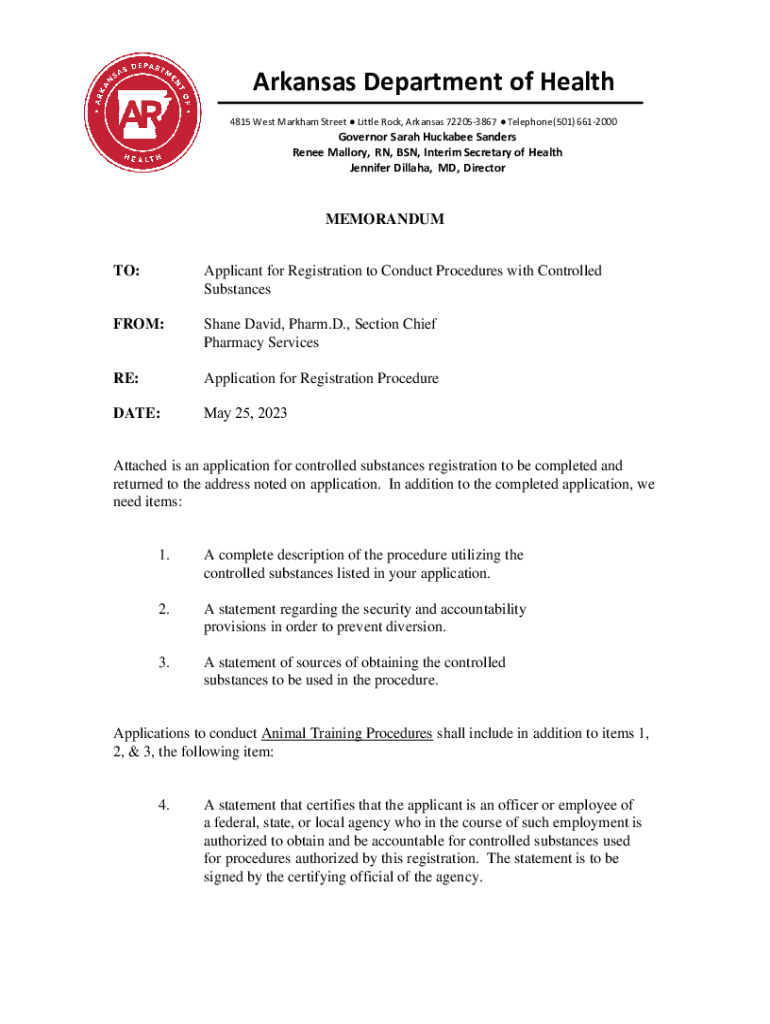 Arkansas Department of Health 4815 West Markham Street Little Rock, Arkansas 722053867 Telephone (501) 6612000Governor Sarah Huckabee Sanders Renee Mallory, RN, BSN, Interim Secretary of Health Jennifer Dillaha, MD, DirectorMEMORANDUM TO:Applicant for Registration to Conduct Procedures with Controlled SubstancesFROM:Shane David, Pharm.D., Section Chief Pharmacy ServicesRE:Application for Registration ProcedureDATE:May 25, 2023Attached is an application for controlled