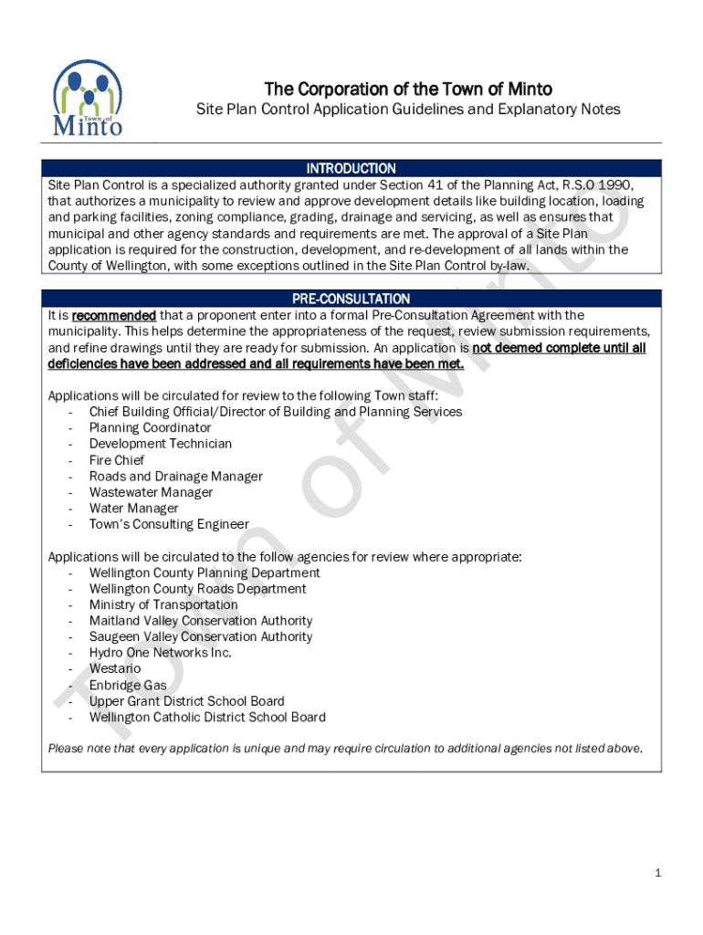 The Corporation of the Town of Into Site Plan Control Application Guidelines and Explanatory NotesINTRODUCTION Site Plan Control is a specialized authority granted under Section 41 of the Planning